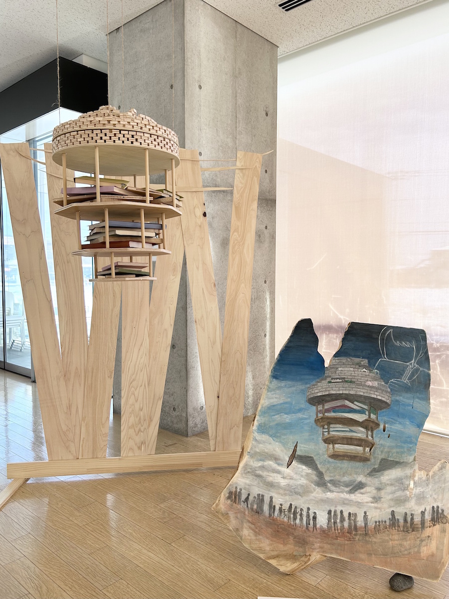 「創作とまわる未来」 20歳という節目を迎え、作品を作れるのはこれまでの人生経験があってこそだなと改めて思った。それが例え悲しくても嬉しくても、色んな人との関わりは作品を生む力となり、そこからまた新しい関わりが始まるという循環を繰り返しながら、全ての人が目指す場所へ進んでいけたらという願いを込めて作品を作った。 |